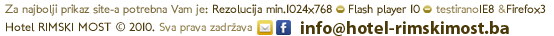 Hotel "RIMSKI MOST" je moderan, novoizgrađeni objekat na obali kirstalno čiste rijeke Bosne. Prostire se na površini od 12.500m2. U najljepšem prirodnom ambijentu, uz tihi šum vode i riječnu obalu, hotel predstavlja atraktivno i romantično mjesto. Za sve koji žele uživati u ljepotama netaknute prirode i doživjeti istinski gurmanski ugođaj. Blizina aerodroma, glavnog saobraćajnog terminala, značajnih kulturnoistorijskih spoenika, privrenih centara kai iobrazovnih istitiucija lokaciju Hotel "RIMSKI MOST" čini idealnom za sve vrste i tipove smještaja, odmora i poslovnih aktivnosti. Kapaciteti, sadržaji i infrastruktura hotela besprjekorna organizacija, bogata ponuda i kvalitetna usluga garantuju uspješnu realizaciju svih manifestacija i vidova smještaja. Jednostavno hotel u centru i žiži zbivanja, s potrebnom dozom intime, tople domaće atmosfere i optimalnih uslova za boravak.